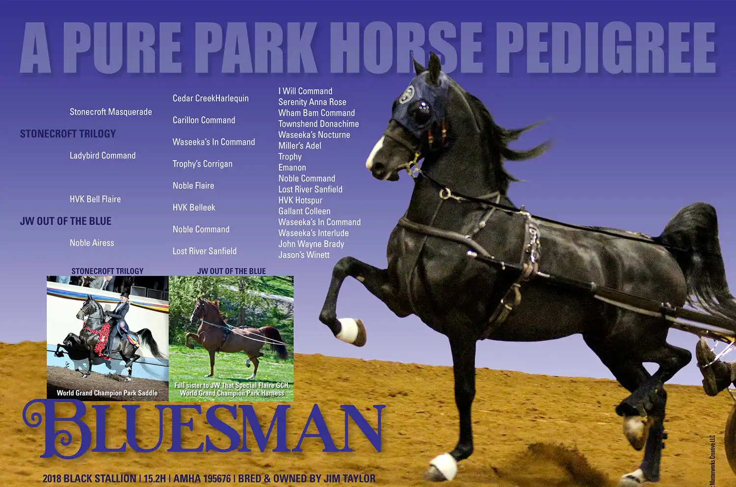 By the incomparable, multi-World Champion Stonecroft Trilogy, out of a full sister to multiple World Champion JW That Special Flaire GCH, BLUESMAN is a veritable pot of gold of great Morgan performance blood.